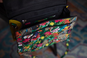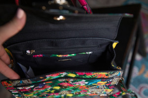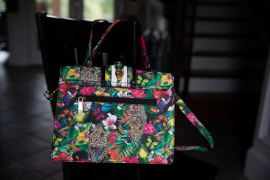 Aldo Jungle & Jaguar Print Handbag with Adjustable & Removable Shoulder Strap and Top Handle. One Exterior Pocket. Four Interior Pockets, One with Zipper Closure. Gold Chain & Rhinestone Jaguar Detail. 11.5" x 9"