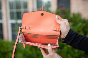 Kate Spade Melon Mini Crossbody. Adjustable Shoulder Strap. Two Interior Sections, One with Zipper Closure. Magnetic Closure, Exterior Pocket. 6 Interior Credit Card Slots. 8" x 5"