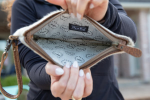Myra Bag Cowhide Patchwork Wristlet. Removable Wristlet Strap. Zipper Closure. 10" x 6"