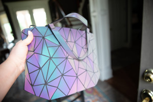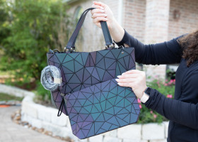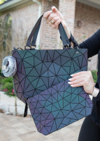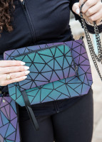 Lovevook Holographic Geometric Handbag Set. Handbag with Two Handles & Removable Shoulder Strap, Three Interior Pockets, one with Zipper Closure, 15" x 10". Evening Bag/Clutch with Removable Chain Strap, One Interior Pocket, 11.25" x 7.25". Wallet/Wristlet with Removable Wristlet Strap, Zipper Closure & Three Interior Credit Card Slots, 7.5" x 4.5"