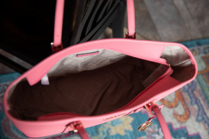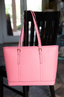 Michael Kors Jet Set Leather Shoulder Back with Adjustable Straps in Pink. Zip Top Closure with Three Interior Pockets, One with Zip Closure. 16" x 12"
