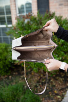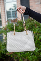 Michael Kors Teagan Powder Blush MK Monogram Satchel. Exterior Print is Cream with MK Tan Monogram, Blush Leather and Gold Chain Long Shoulder Straps, Three Interior Sections one with Zipper Closure. Three Interior Pockets. 12" x 9"