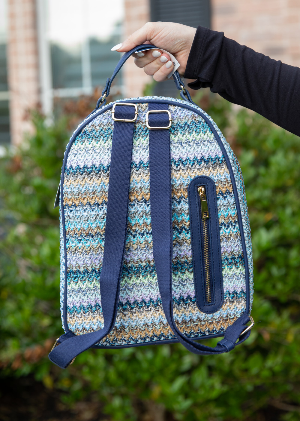 Tommy Bahama Blue & Purple Crochet Backpack. Adjustable Backpack Straps & Top Handle. Zip Closure with and Exterior Zipper Pocket. Three Interior Pockets, One with Zip Closure. 13" x 10"