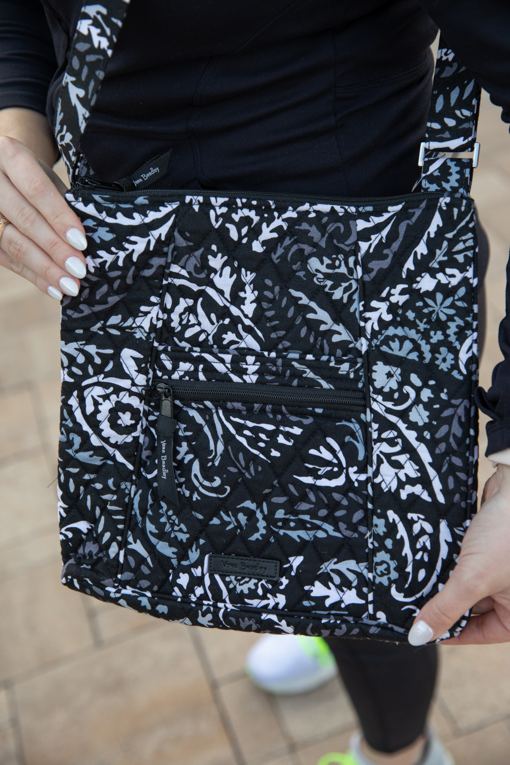 Vera Bradley Black Hipster Crossbody Adjustable Strap, Three Exterior Pockets, Two with Zipper Closure. Top Zipper Closure. Two Interior Pockets. 11" x 11"