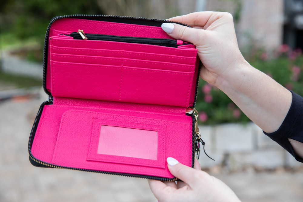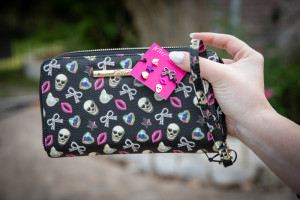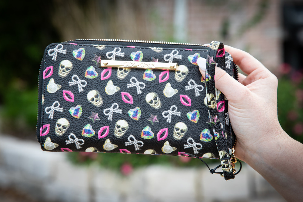 Betsey Johnson Skull & Bow Wristlet, Removable Wristlet Strap, Zip Closure, Three Interior Pockets, One with Zipper Closure, 12 Credit Card Slots. Earrings. 8" x 5"