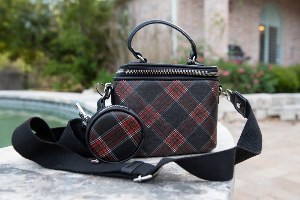 Madden Girl Black & Red Plaid Vanity Crossbody Purse with Detachable Coin Purse. Adjustable & Removable Crossbody Strap and Top Handle. 6" x 8"
