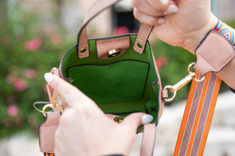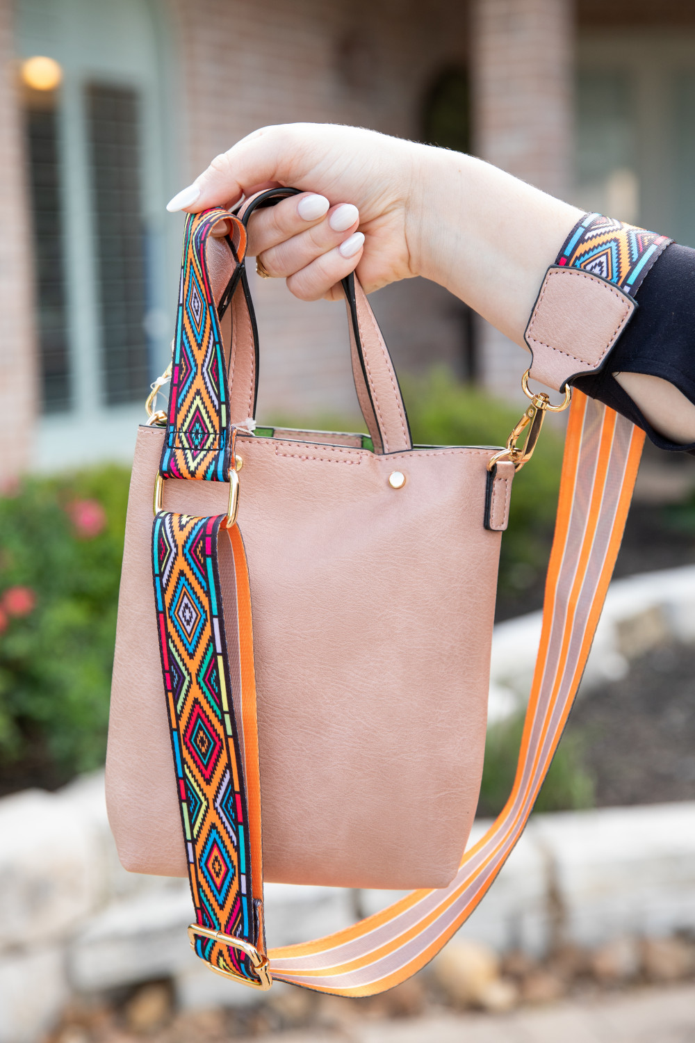 Le Miel Pale Pink Crossbody with Removable Multicolor Crossbody Strap & Handles. Snap Closure & One Interior Pocket. 8" x 8"