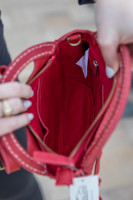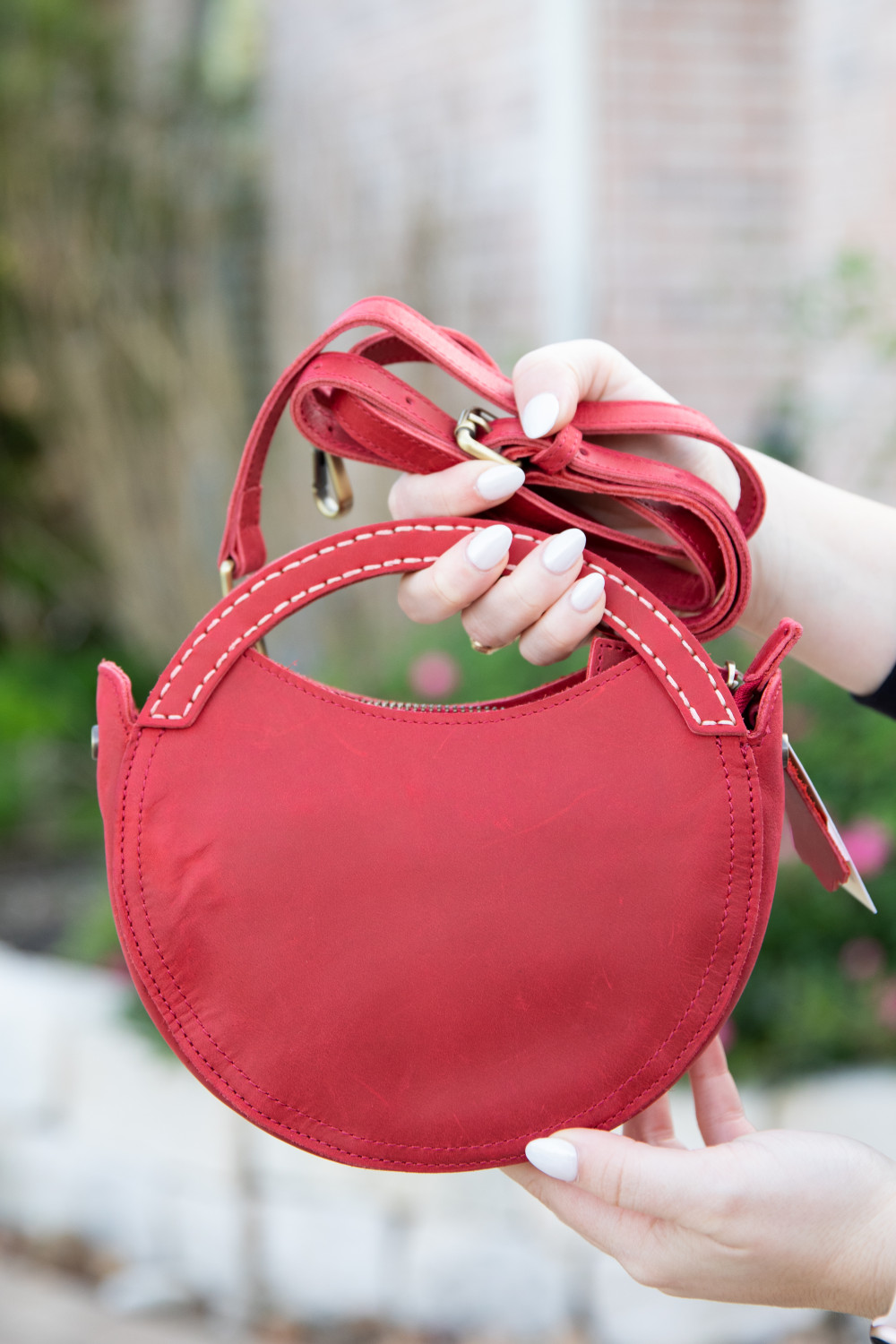 Overland Red Leather Circle Clutch/Crossbody. Adjustable & Removable Shoulder Strap. Zipper Closure. Two Interior Pockets, One with Zipper Closure. 8" x 8"