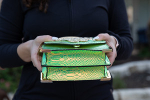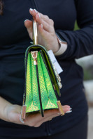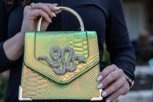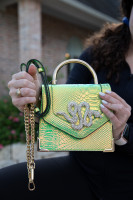 Aldo Neon Iridescent Snakeskin Print Handbag with Rhinestone Snake Detail. Removable and Adjustable Shoulder Strap & Gold Metal Top Handle. Two Interior Pockets, One with Zipper Closure. 7.5" x 7"