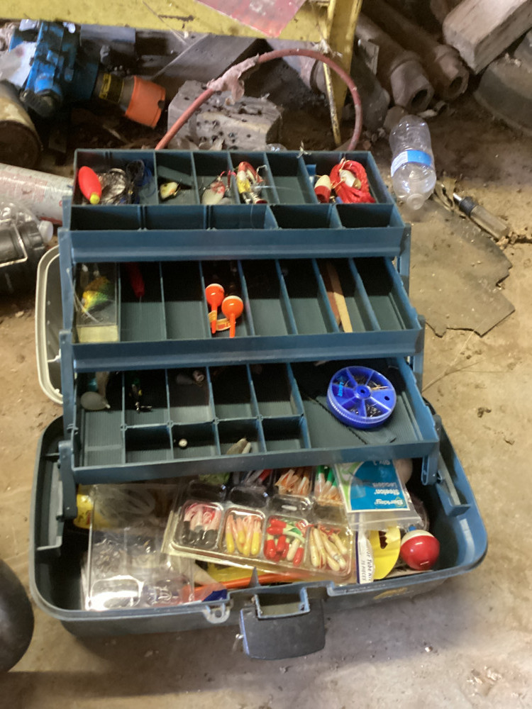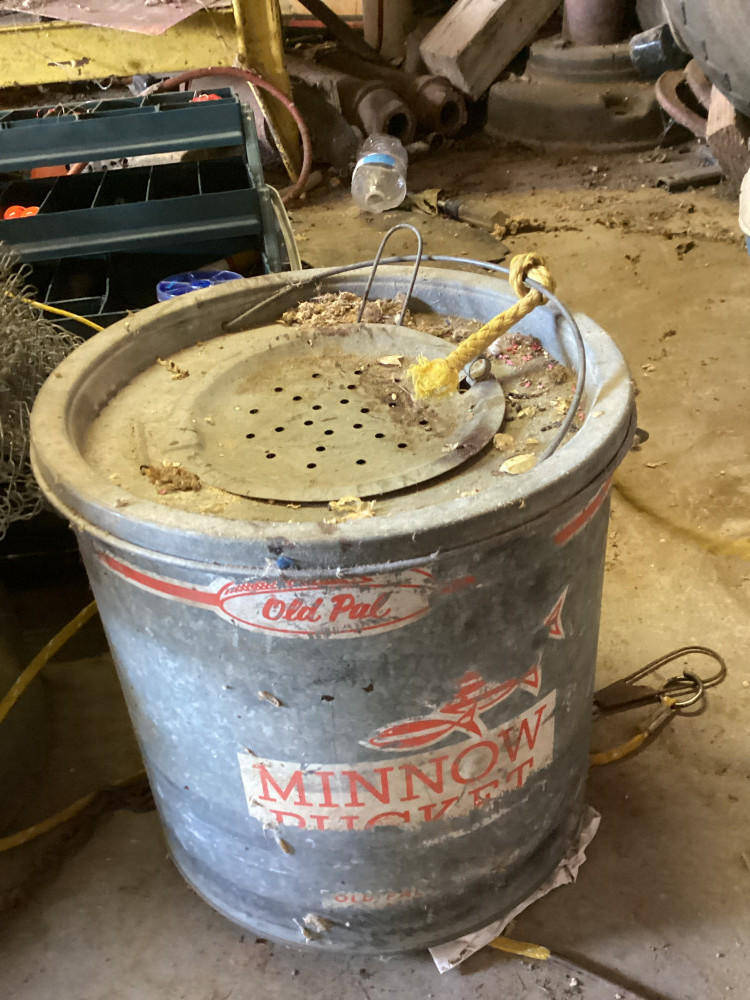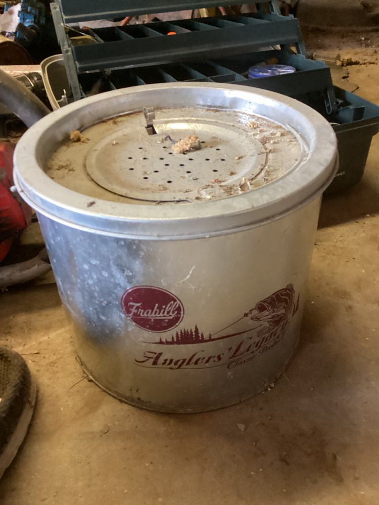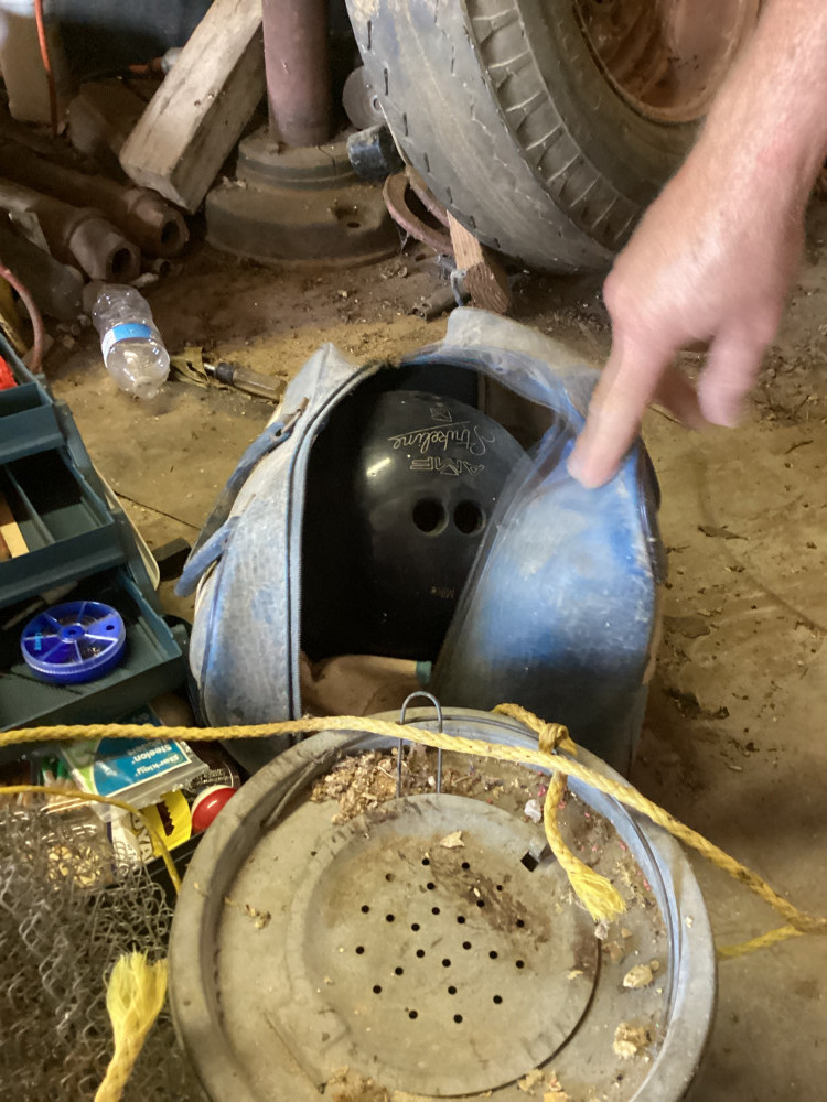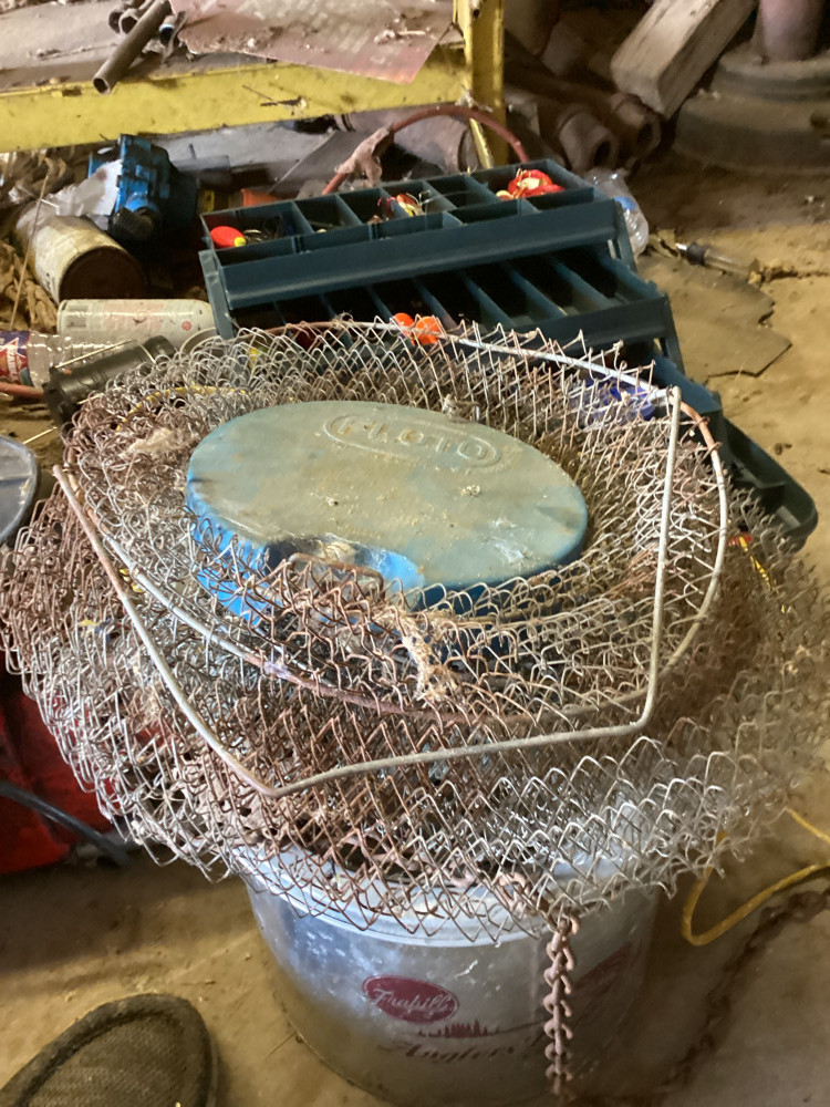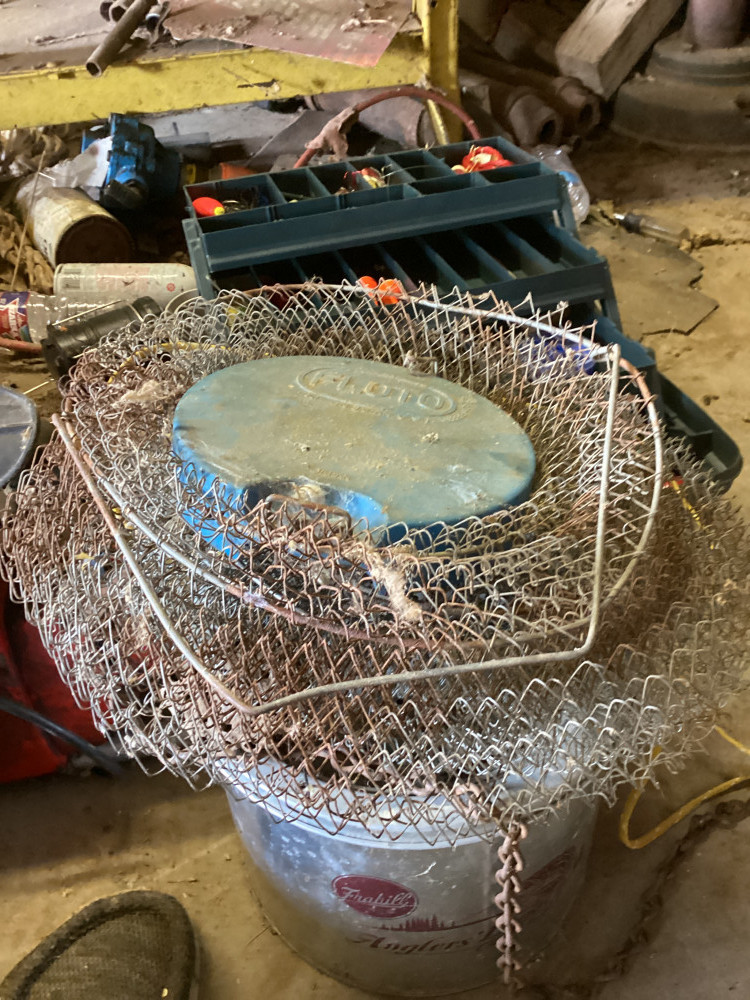 minnow bucket, bowling ball, fishing stuff