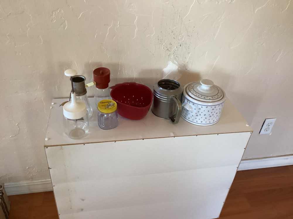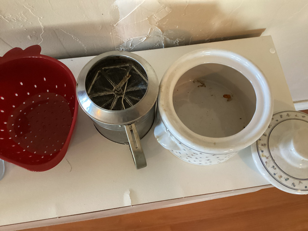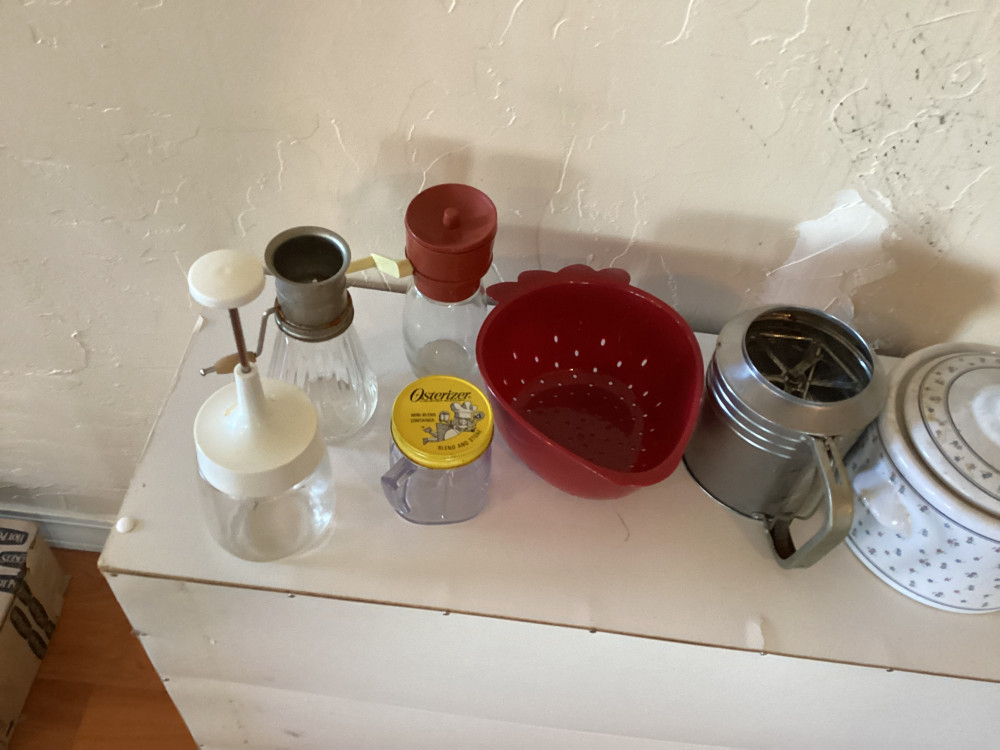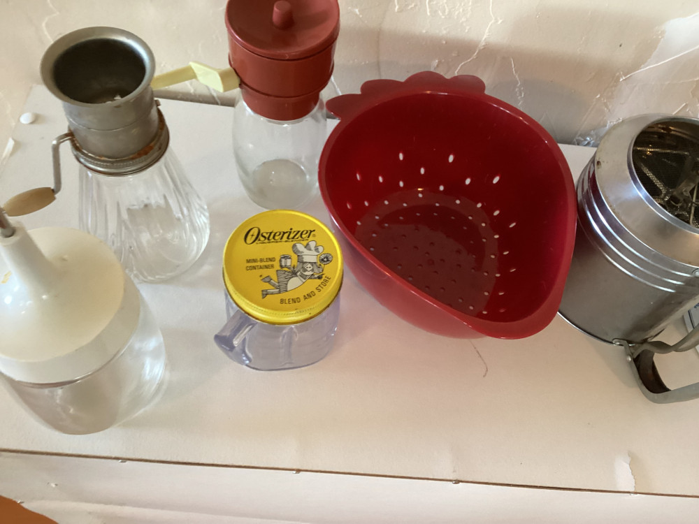 strawberry shaped strainer, chopper, glass jar, pot with lid