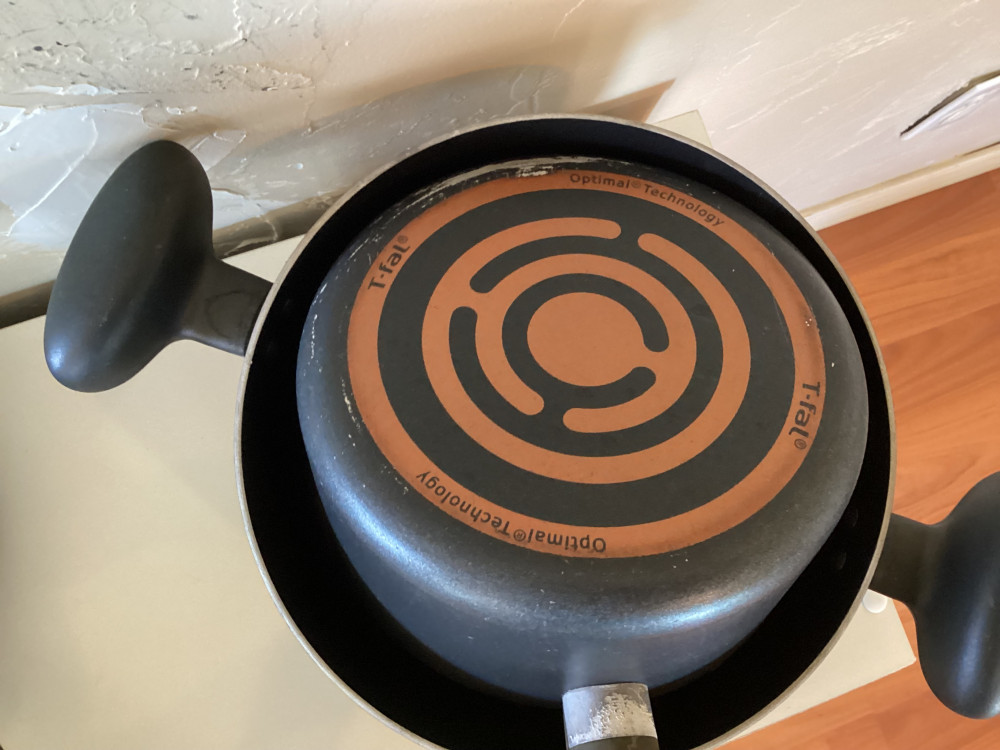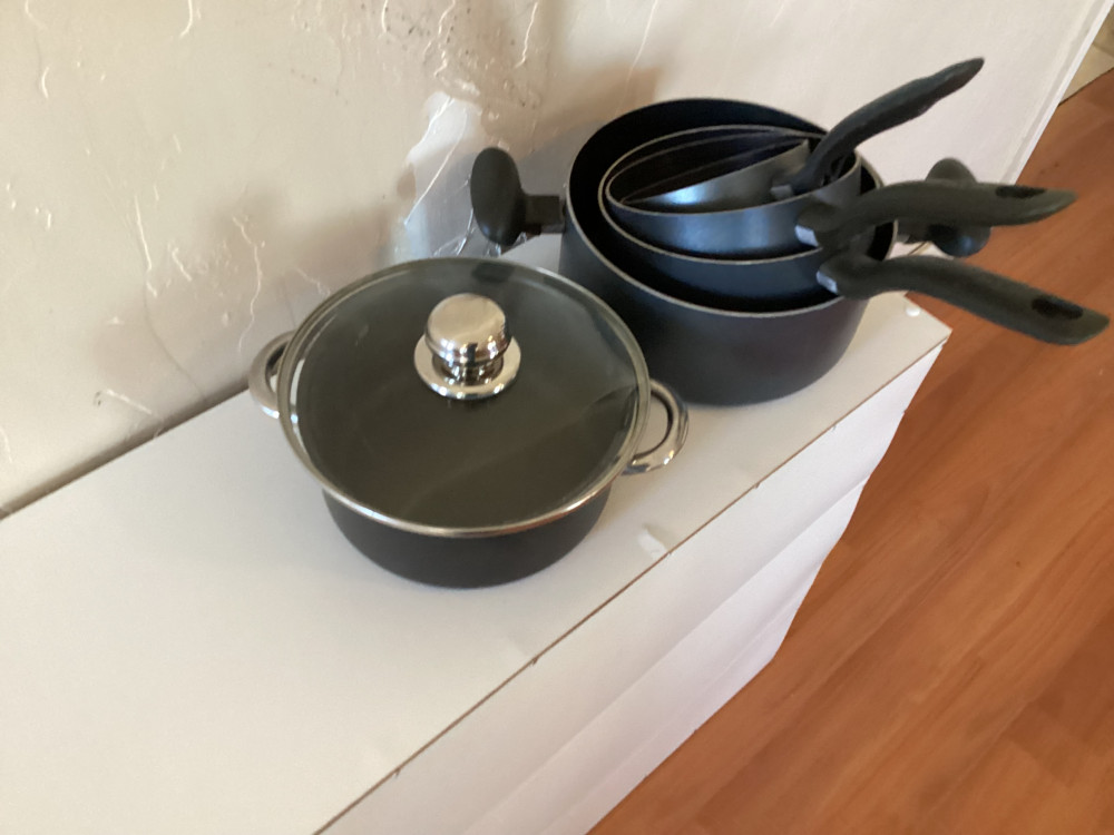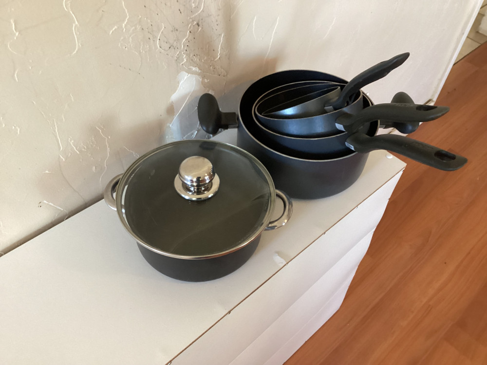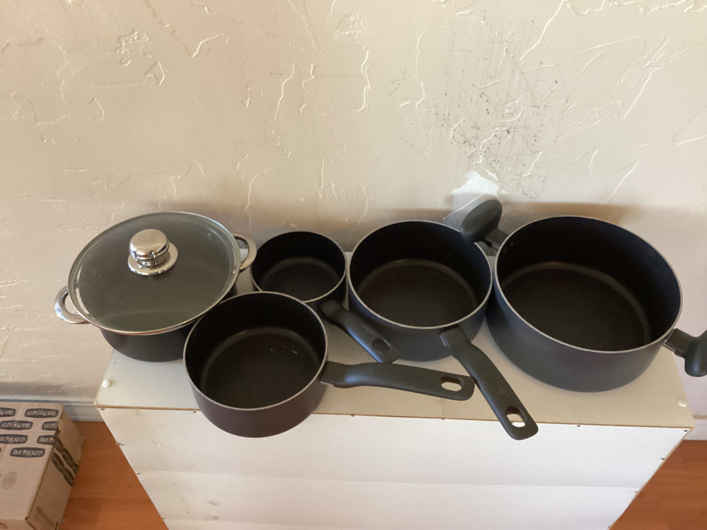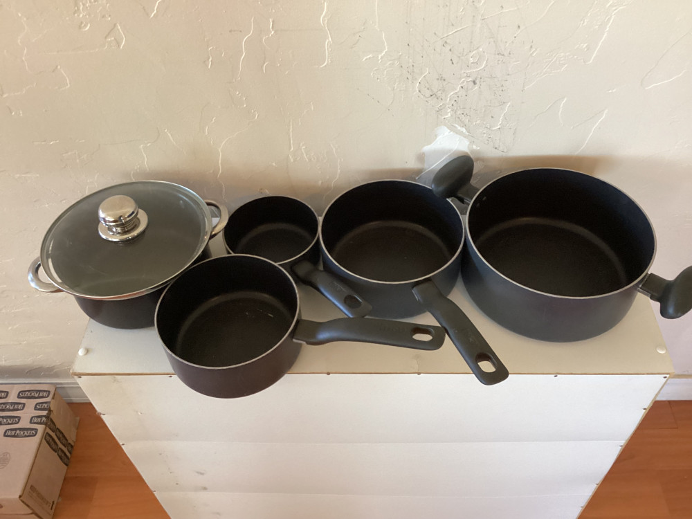 set of 5 black pots and pans- 1 has lid