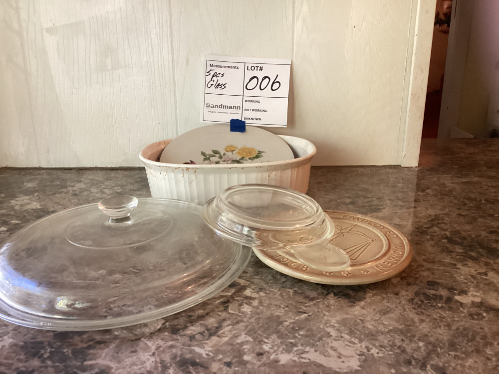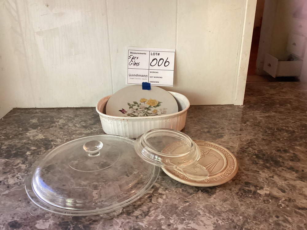 assortment of glassware; floral plate, baking dish, big lid, pie plate, printed plate
