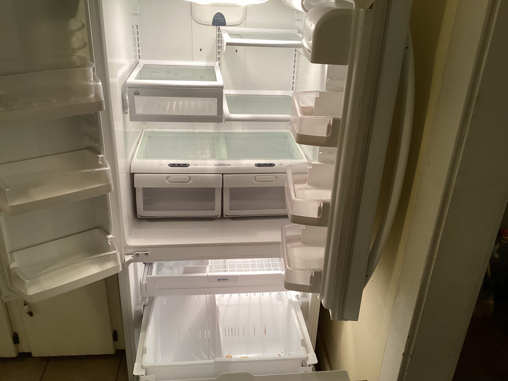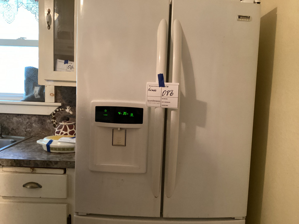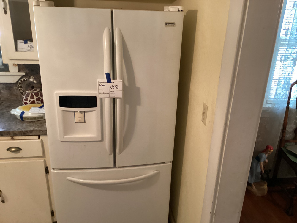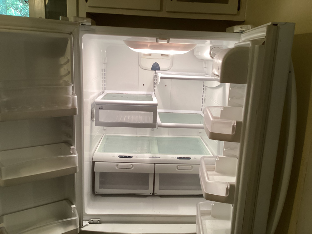 white Kenmore refrigerator, double door, ice in door, freezer drawer on bottom. Fridge is clean
