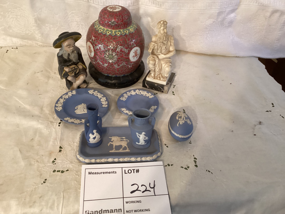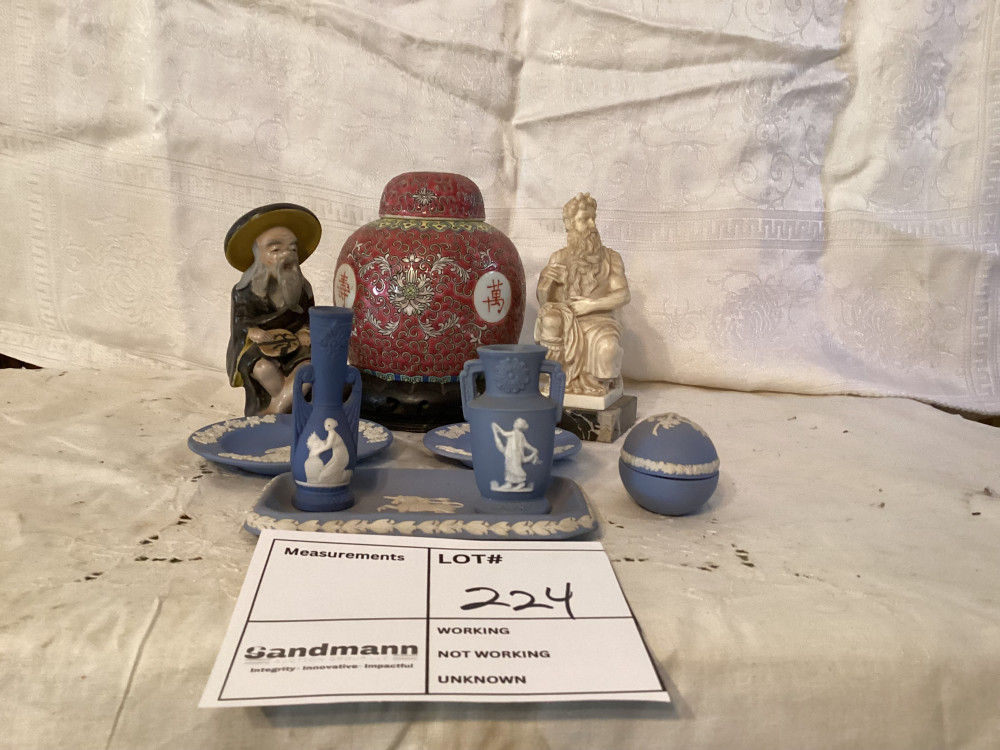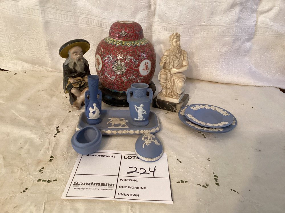 blue and white pottery set, red vase,2 collectible figurines
