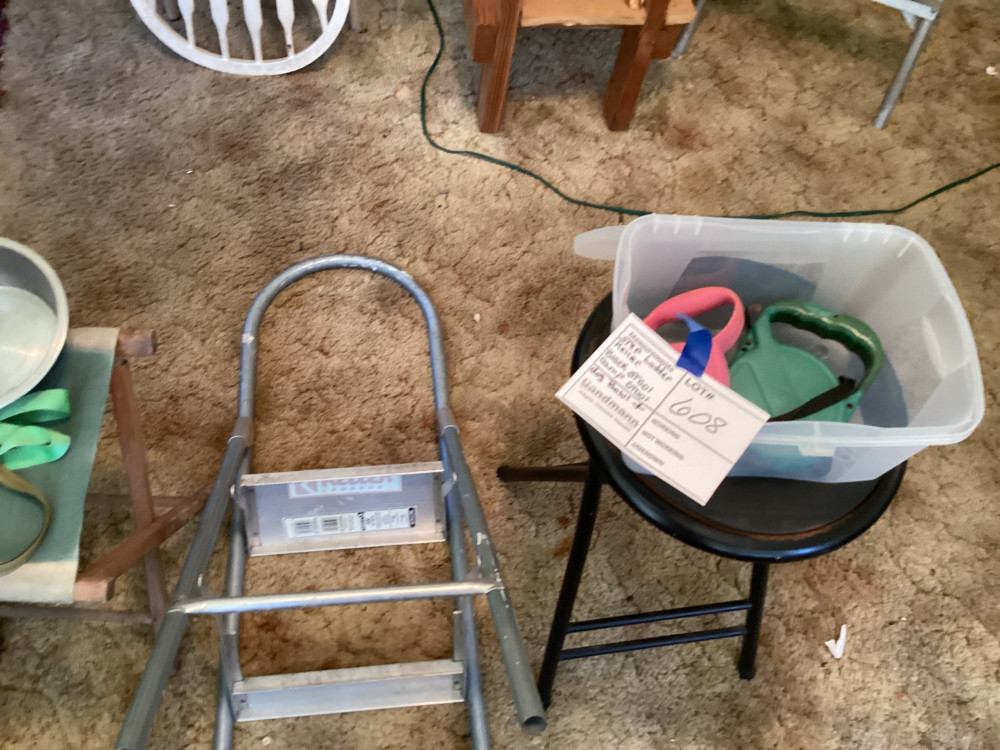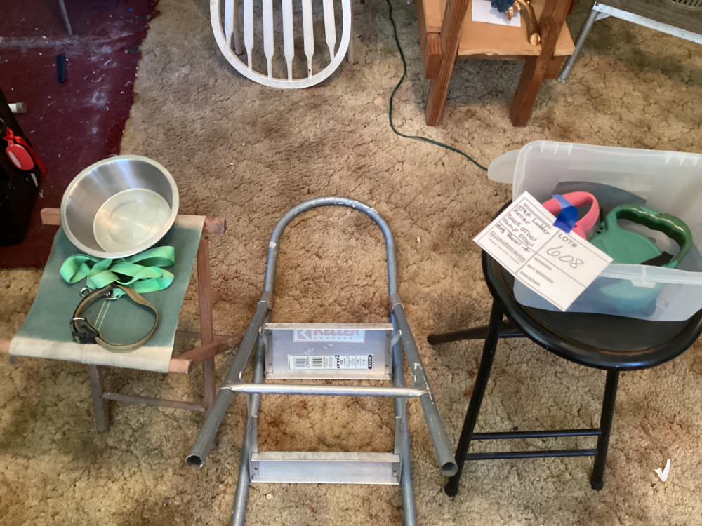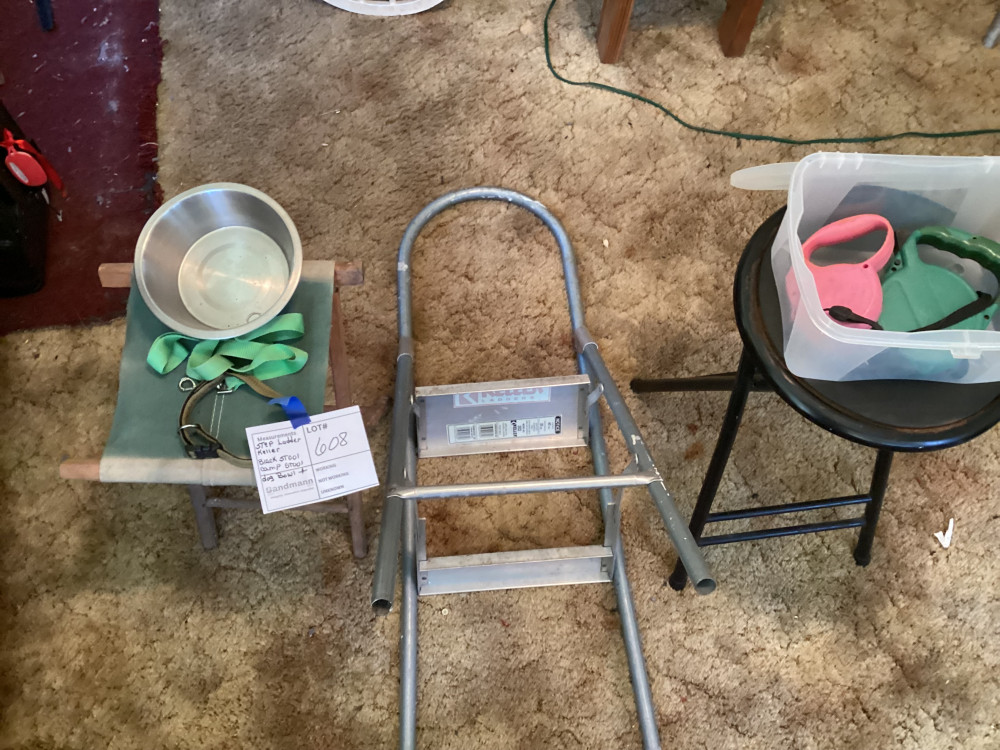 black bar stool, step ladder, metal dog bowl, and dog leashes