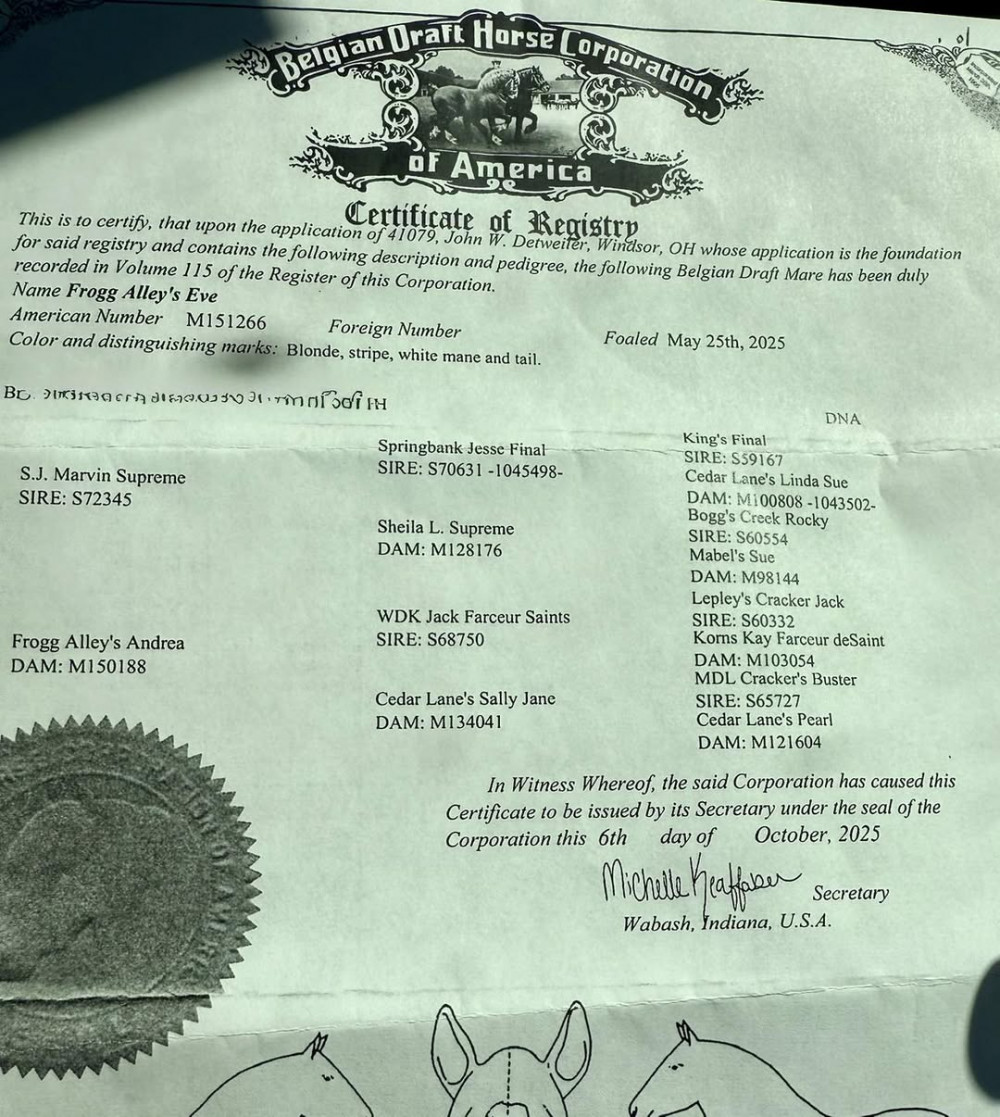 This May 2025 registered Belgian filly is halter broke, super gentle, and absolutely gorgeous! π Stunning blonde with a stripe and white mane and tail - she's a total showstopper! β¨ Her dad S.J. Marvin Supreme is a BIG proven stud with babies out there winning πͺ If you want championship bloodlines wrapped up in a sweet, easy-to-handle package, Eve's your girl! She's got the looks, the pedigree, and the temperament to be your next star! Don't miss this beauty! πππ