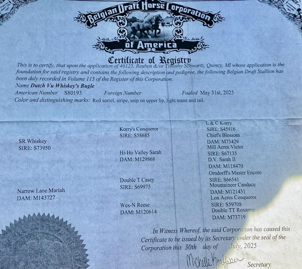 This May 2025 weanling registered Belgian colt is halter broke, super sweet, and laid back - but don't let that fool you, this boy is gonna be MASSIVE! π±πͺ Gorgeous red sorrel with a stripe and snip, he's got the looks AND the temperament. His sire SR Whiskey isn't just any stallion - he's a Senior Champion Stallion at the Indiana State Fair AND a Belgian Jr. Champion & Grand Champion Stallion - Reserve at the Michigan Great Lakes International show! ππ When your dad's trophy case needs its own barn, you know you're getting quality! Sweet, calm, and destined to be a gentle giant. Don't miss out on this award-winning bloodline! π