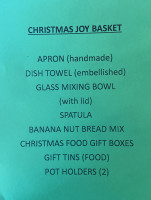 “JOY” Apron, dish towel, glass mixing bowl, spatula, banana nut bread mix, Christmas boxes and tins, pot holders