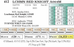 LCHMN RED KNIGHT A064M #5 Cow Fertility EPD, Top 3% Marbling, Top 2.2% Ribeye 11.21.2025 Leachman Fall Roundup Bull & Female Sale 10:00 am MTN | 412 | $ 7,500.00 |