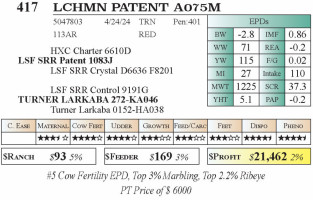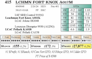 LCHMN BONUS A018M #4 Cow Fertility EPD, Top 2.2% Marbling 11.21.2025 Leachman Fall Roundup Bull & Female Sale 10:00 am MTN | 418 | $ 5,000.00 |