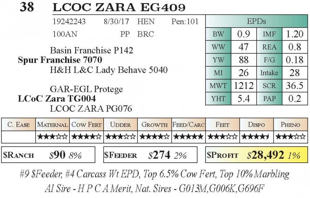 #9 $Feeder, #4 Carcass Wt EPD, Top 6.5% Cow Fert, Top 10% Marbling