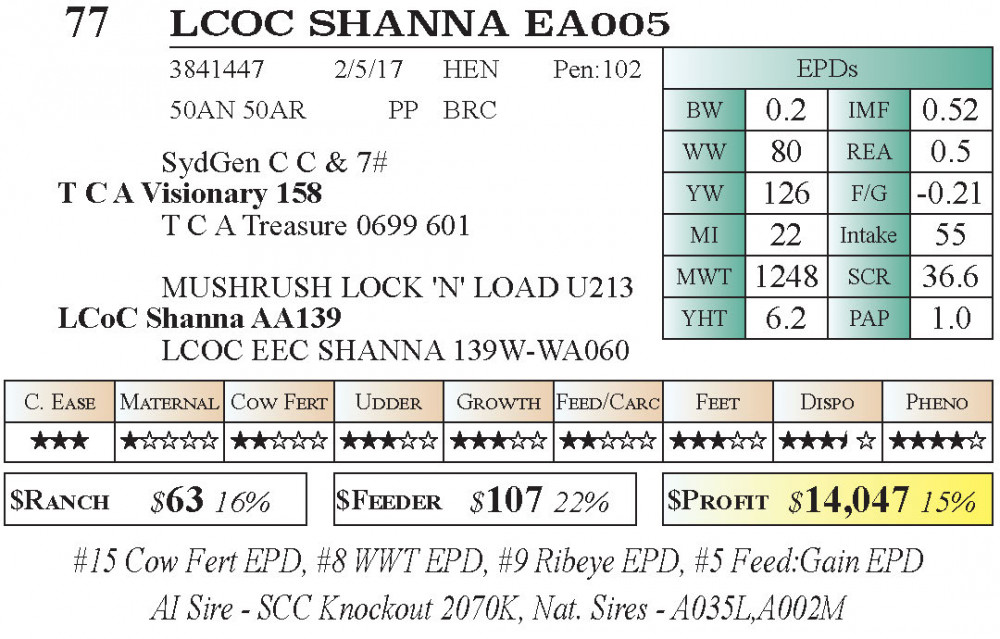 #15 Cow Fert EPD, #8 WWT EPD, #9 Ribeye EPD, #5 Feed:Gain EPD
