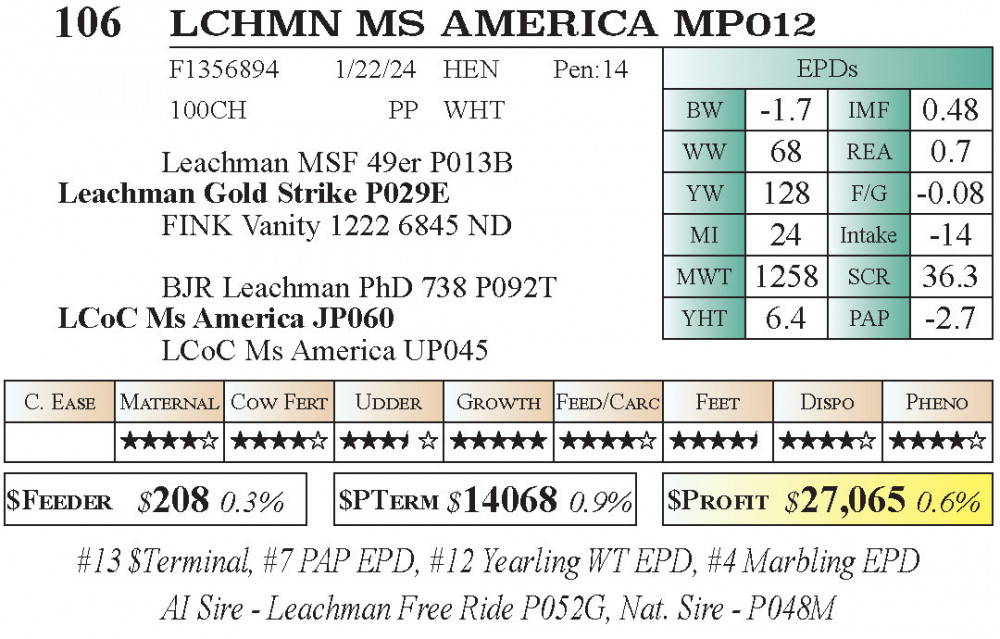 #13 $Terminal, #7 PAP EPD, #12 Yearling WT EPD, #4 Marbling EPD