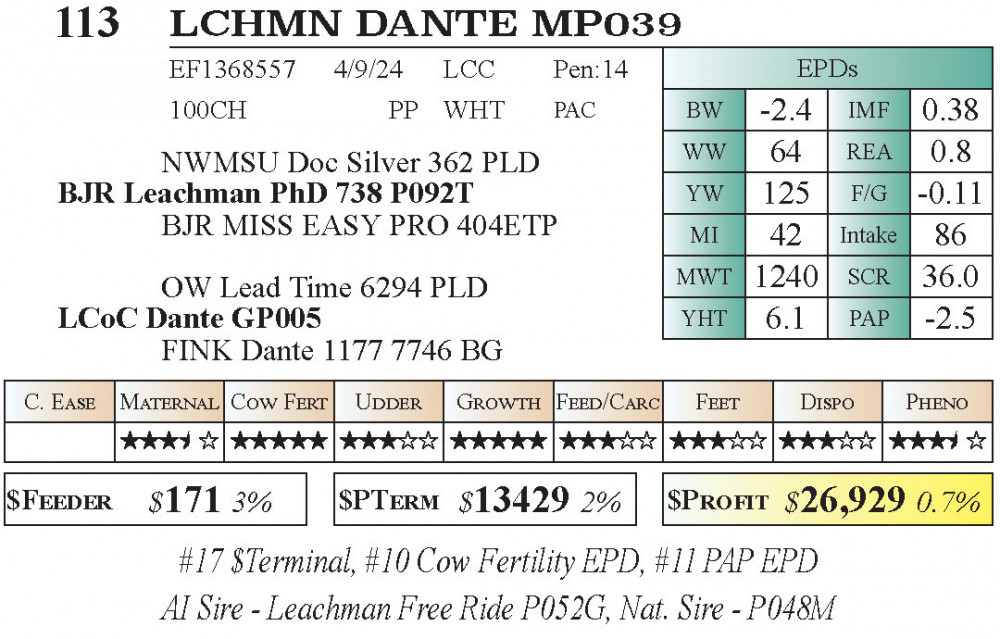 LCHMN DANTE MP039 (#113) 11.21.2025 Leachman Fall Roundup Bull & Female Sale 10:00 am MTN Charolais Female Charolais Female