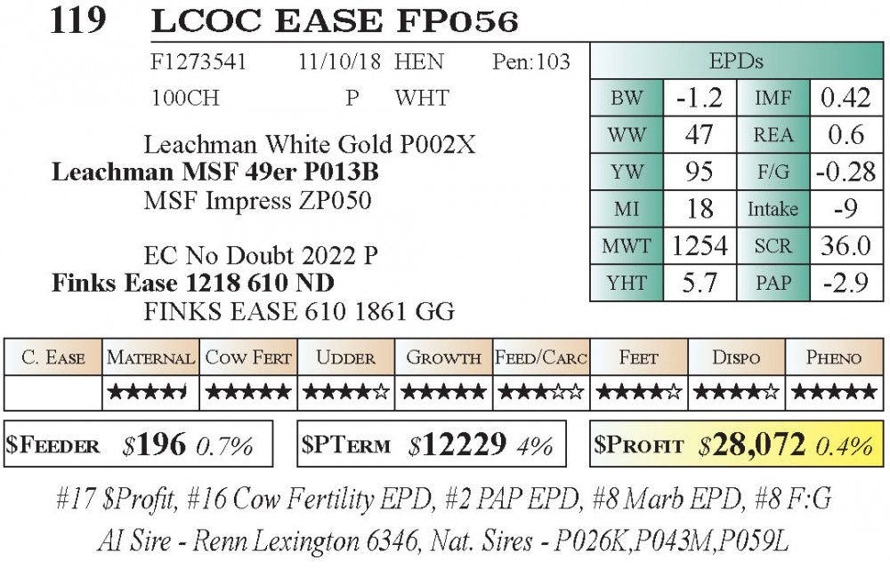 #17 $Profit, #16 Cow Fertility EPD, #2 PAP EPD, #8 Marb EPD, #8 F:G