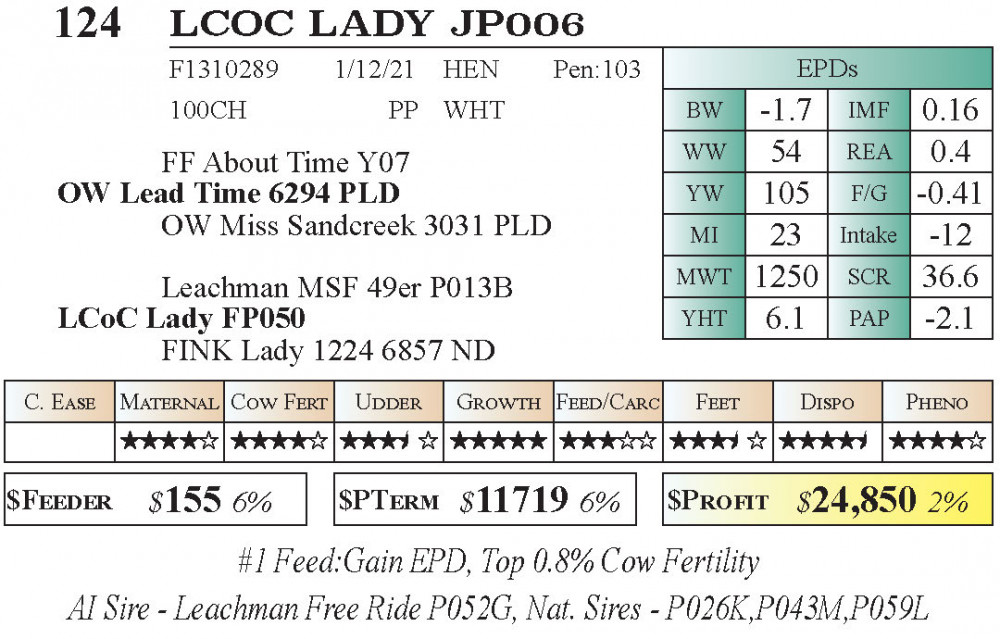 LCOC LADY JP006 (#124) 11.21.2025 Leachman Fall Roundup Bull & Female Sale 10:00 am MTN Charolais Female Charolais Female