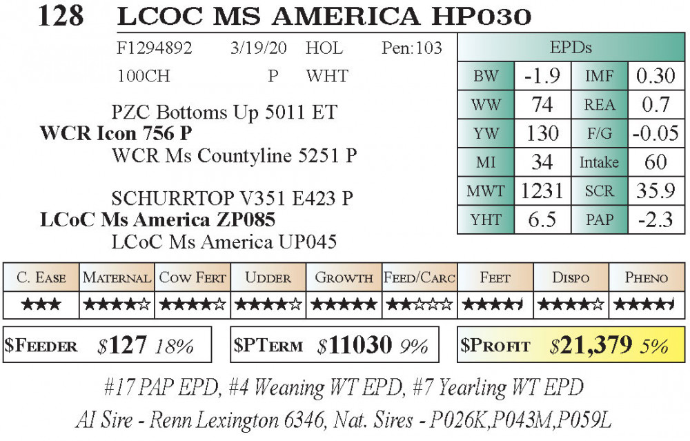 LCOC MS AMERICA HP030 (#128) 11.21.2025 Leachman Fall Roundup Bull & Female Sale 10:00 am MTN Charolais Female Charolais Female