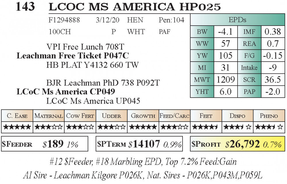 LCOC MS AMERICA HP025 (#143) 11.21.2025 Leachman Fall Roundup Bull & Female Sale 10:00 am MTN Charolais Female Charolais Female