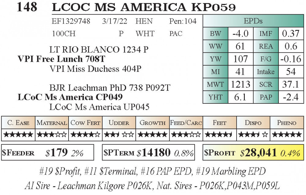LCOC MS AMERICA KP059 (#148) 11.21.2025 Leachman Fall Roundup Bull & Female Sale 10:00 am MTN Charolais Female Charolais Female