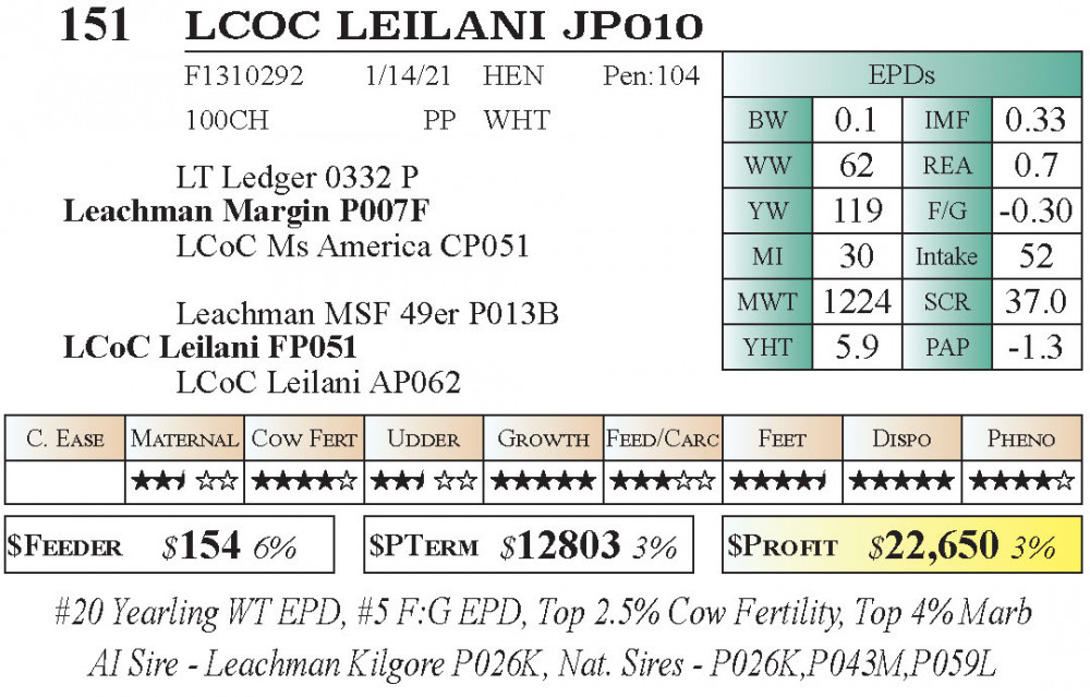 LCOC LEILANI JP010 (#151) 11.21.2025 Leachman Fall Roundup Bull & Female Sale 10:00 am MTN Charolais Female Charolais Female
