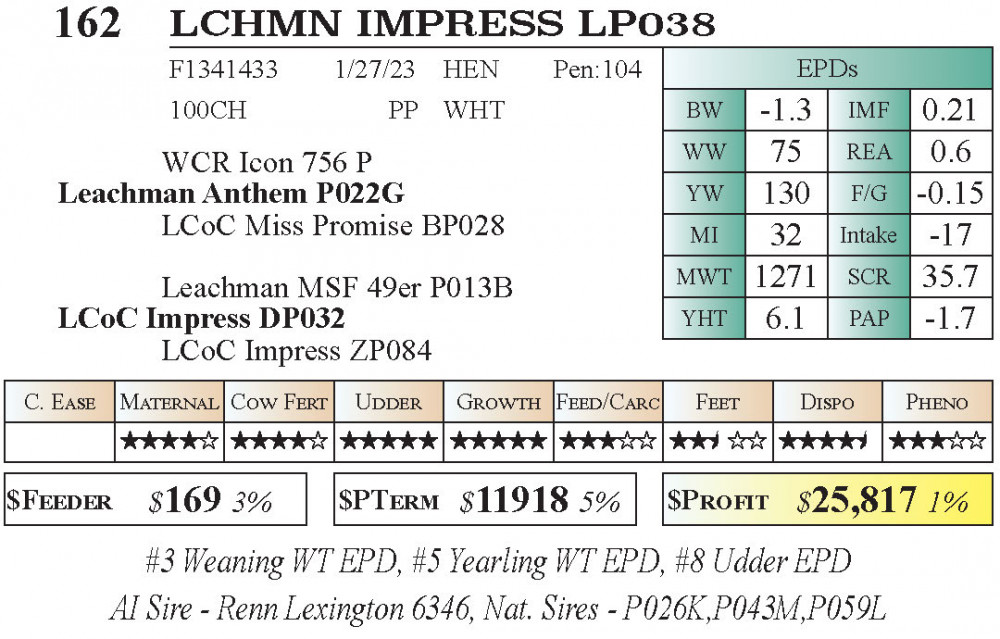 LCHMN IMPRESS LP038 (#162) 11.21.2025 Leachman Fall Roundup Bull & Female Sale 10:00 am MTN Charolais Female Charolais Female