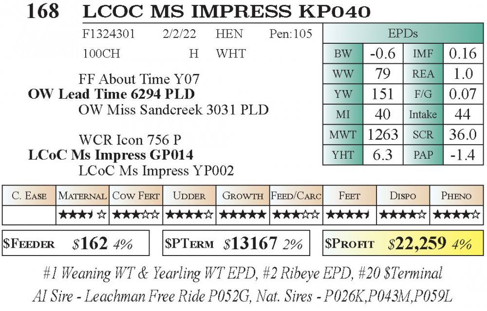 LCOC MS IMPRESS KP040 (#168) 11.21.2025 Leachman Fall Roundup Bull & Female Sale 10:00 am MTN Charolais Female Charolais Female