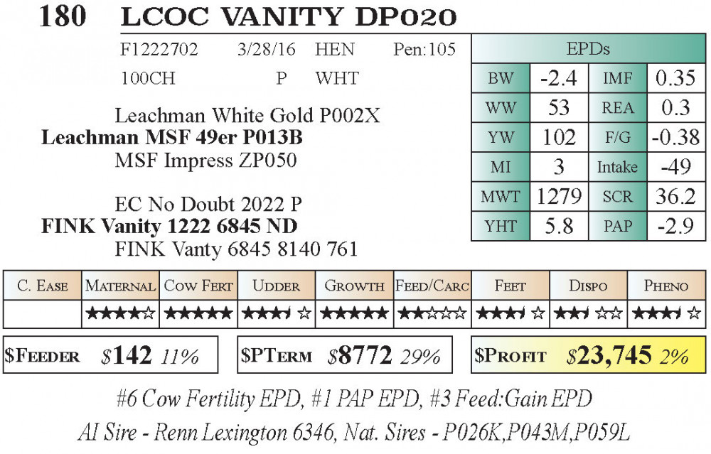 LCOC VANITY DP020 (#180) 11.21.2025 Leachman Fall Roundup Bull & Female Sale 10:00 am MTN Charolais Female Charolais Female