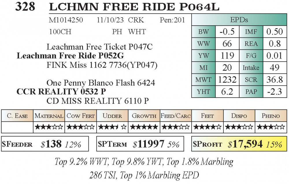LCHMN FREE RIDE P064L (#328) 11.21.2025 Leachman Fall Roundup Bull & Female Sale 10:00 am MTN Charolais
