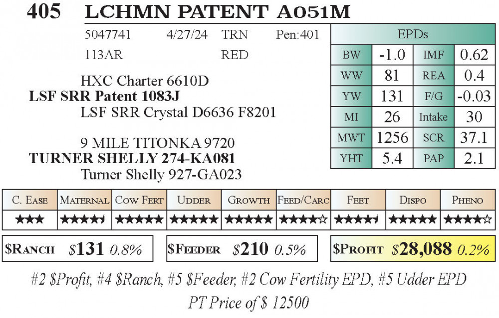 LCHMN PATENT A051M (#405) 11.21.2025 Leachman Fall Roundup Bull & Female Sale 10:00 am MTN PT Bulls - Red Angus