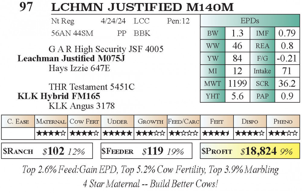 LCHMN JUSTIFIED M140M (#97) 12.18.25 Leachman Texas Fall $Profit Sale 10:00 AM CT Bull - Stabilizer