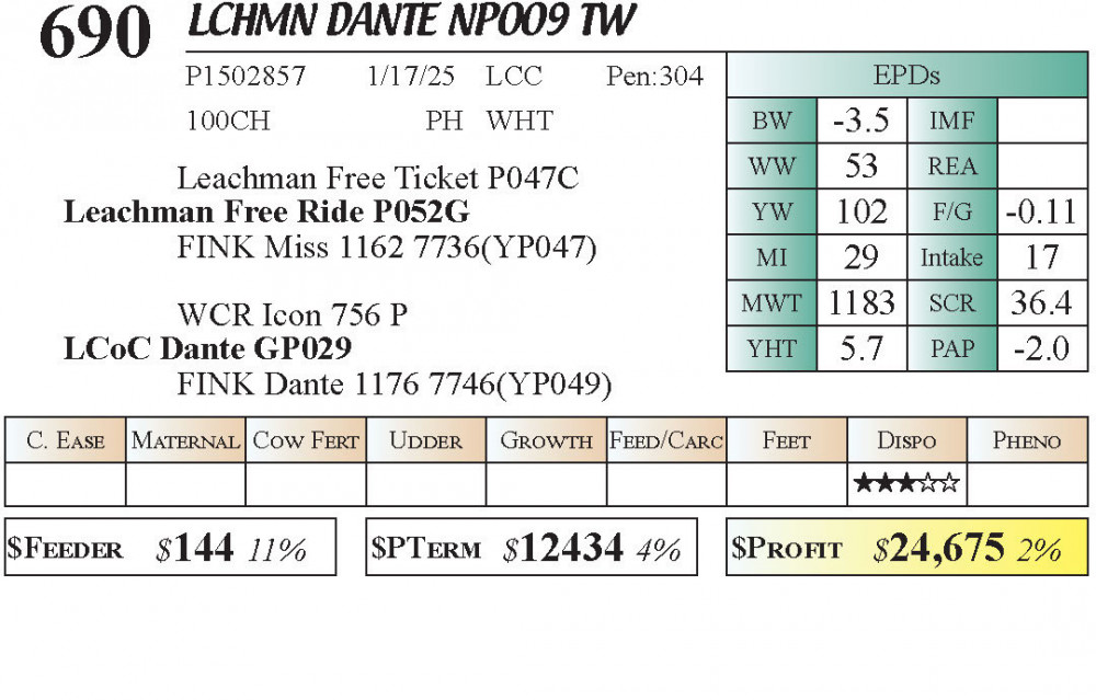 LCHMN Dante NP009 TW (#690) 3.22.26 Leachman Cattle Spring Female Sale 11:30 AM MTN Charolais Female