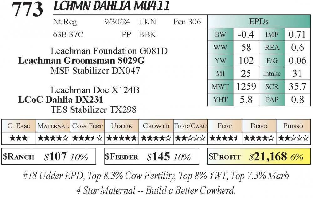 LCHMN Dahlia MU411 (#773) 3.22.26 Leachman Cattle Spring Female Sale 11:30 AM MTN Stabilizer Female
