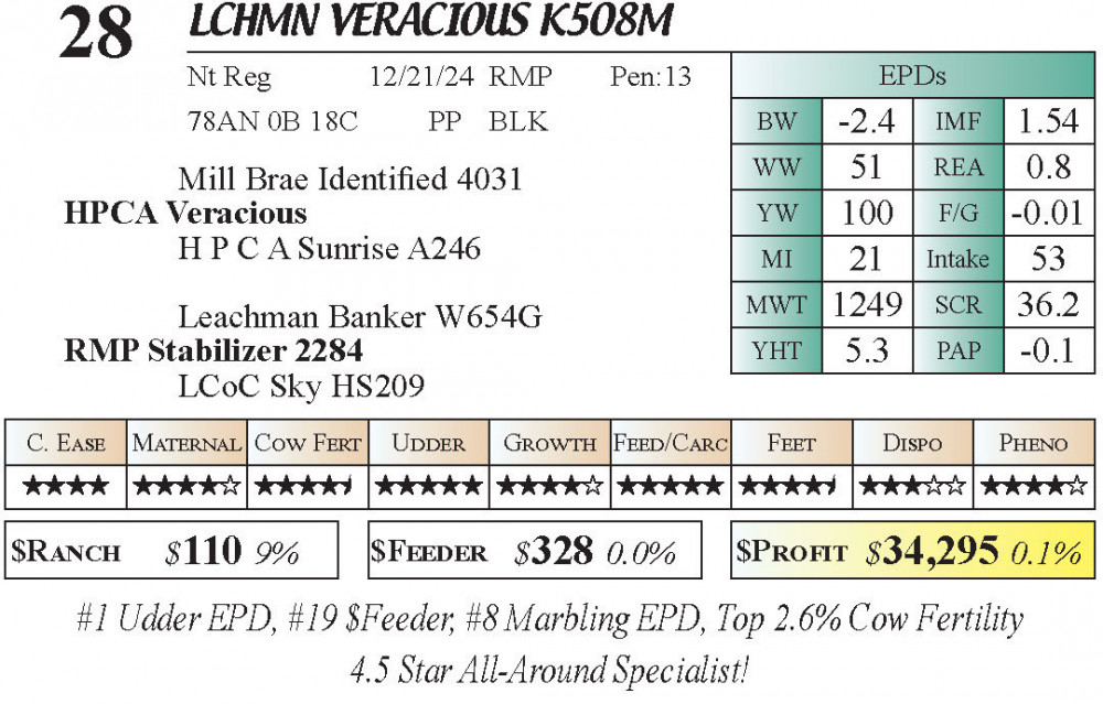 LCHMN Veracious K508M (#28) 3.23.26 Leachman Cattle Spring Bull Sale 10:00 AM MTN 4 & 5 Star Calving Ease Bulls Bull - Stabilizer Top 75 $Feeder Bulls