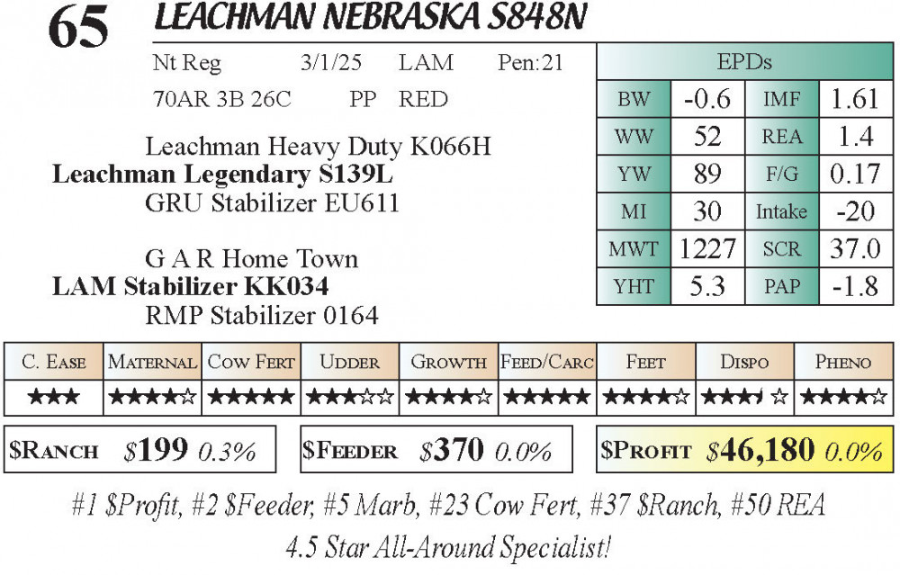 Leachman Nebraska S848N (#65) 3.23.26 Leachman Cattle Spring Bull Sale 10:00 AM MTN Bull - Stabilizer Top 100 $Profit Top 75 $Feeder Bulls Top 75 $Ranch Bulls