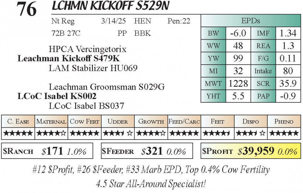 LCHMN Kickoff S529N (#76) 3.23.26 Leachman Cattle Spring Bull Sale 10:00 AM MTN 4 & 5 Star Calving Ease Bulls Bull - Stabilizer Top 100 $Profit Top 75 $Feeder Bulls