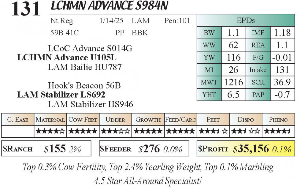LCHMN Advance S984N (#131) 3.23.26 Leachman Cattle Spring Bull Sale 10:00 AM MTN Bull - Stabilizer Top 100 $Profit