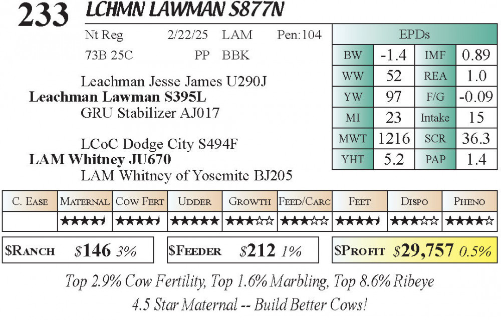 LCHMN Lawman S877N (#233) 3.23.26 Leachman Cattle Spring Bull Sale 10:00 AM MTN Bull - Stabilizer