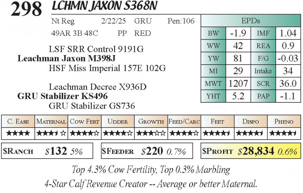 LCHMN Jaxon S368N (#298) 3.23.26 Leachman Cattle Spring Bull Sale 10:00 AM MTN 4 & 5 Star Calving Ease Bulls Bull - Stabilizer