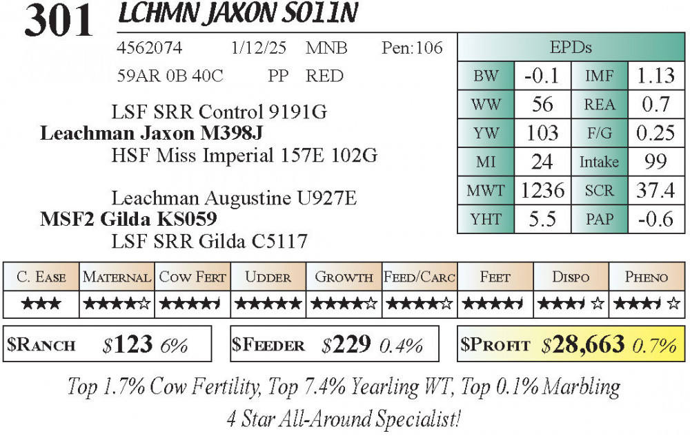 LCHMN Jaxon S011N (#301) 3.23.26 Leachman Cattle Spring Bull Sale 10:00 AM MTN Bull - Stabilizer